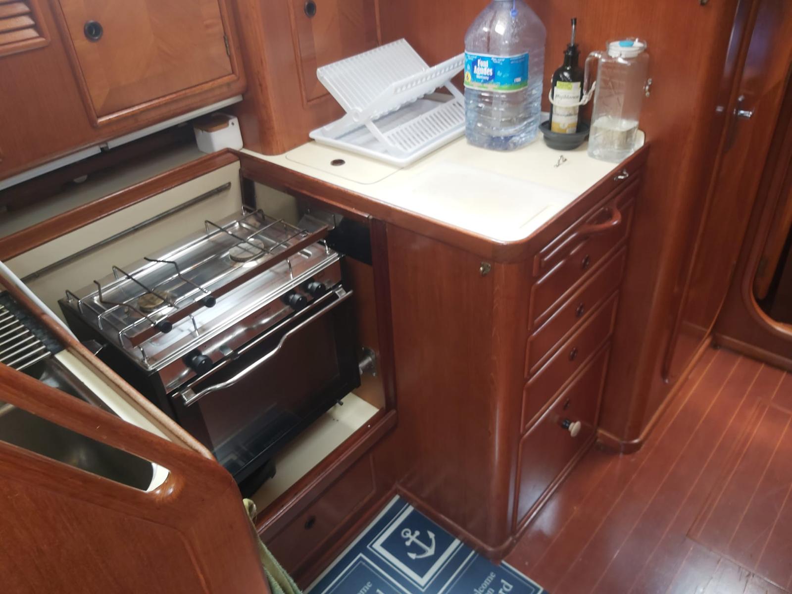 Cocina completa con horno, fregadero de doble seno y grifo alto, ideal para preparar comidas cómodamente durante las travesías.